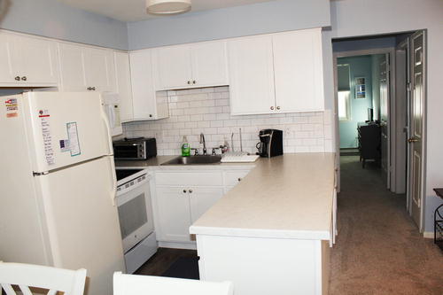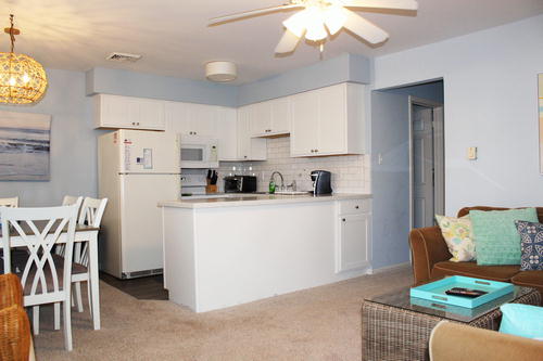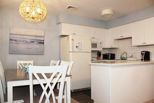 Centrally located 2nd floor condo with one off street parking spot. Located steps from the beach, promenade, convenience st ore, bars & restaurants. Walk to everything! This unit offers a large open concept kitchen, dining room and living room. One bedroom with a queen bed and second bedroom with pyramid bunk bed (double on bottom and single on top).(not pictured) Single trundle also available. Small deck to relax and enjoy the ocean breeze! Family friendly condo community.