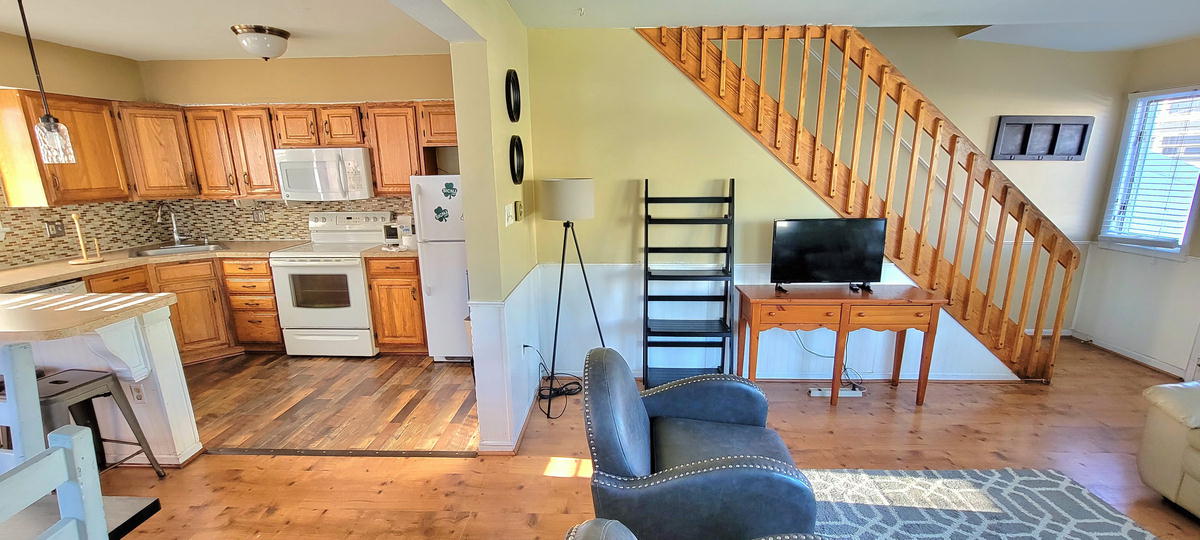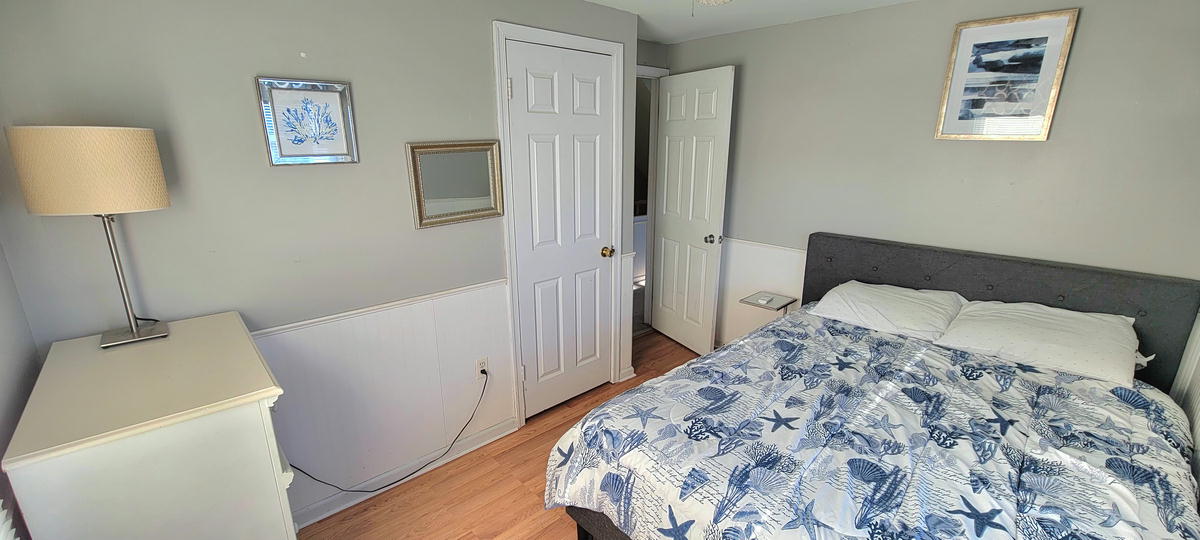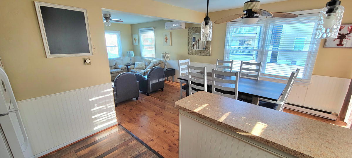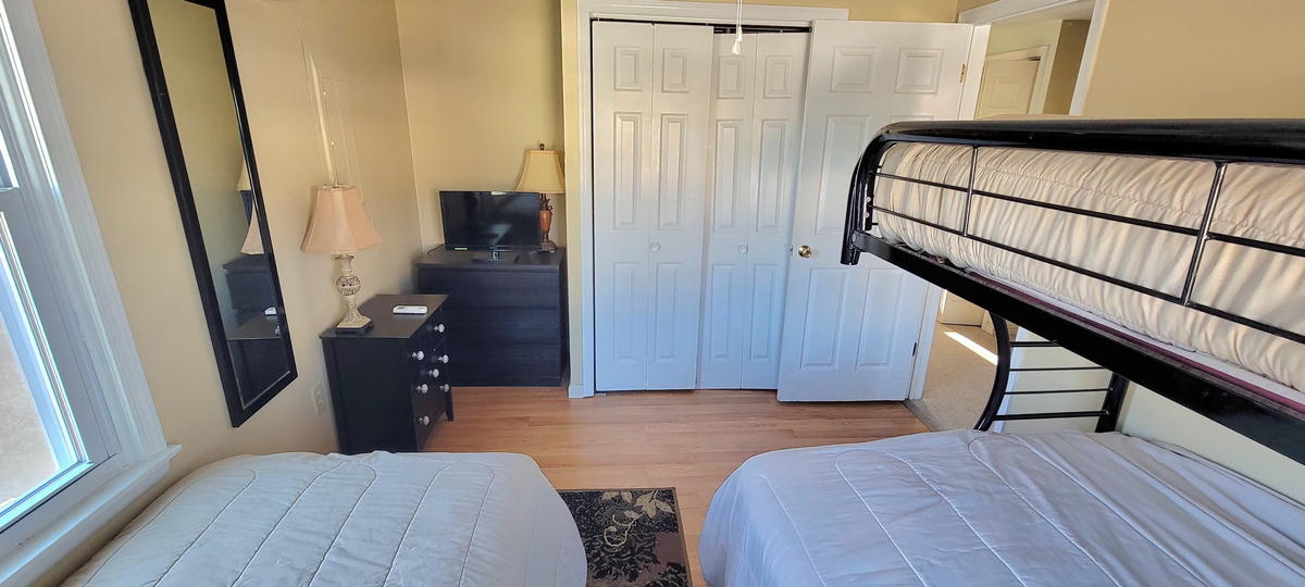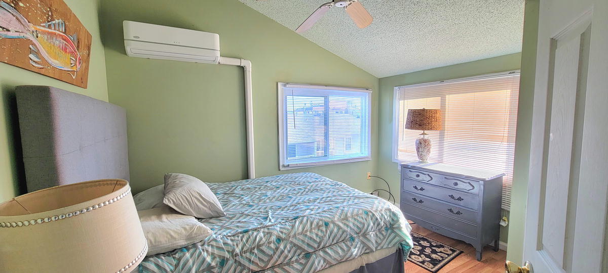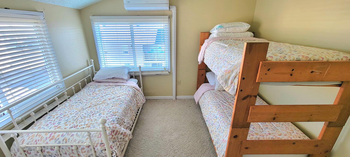 The first floor has hardwood floors throughout.The 2nd floor has 2 bedrooms and a full bathroom. One bedroom with a pyramid bunk (full on bottm and single on top) plus a single bed. Second bedroom with a double bed. The 3rd floor has 2 bedrooms and a full bathroom. Third bedroom with a bunk bed and a single be and fourth bedroom with a queen bed. There are 3 floors to this unit. The air conditoning is mini split units. There is also a queen air mattress.