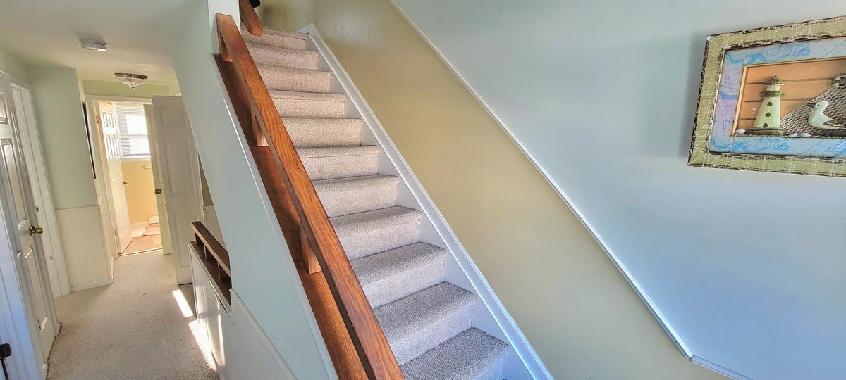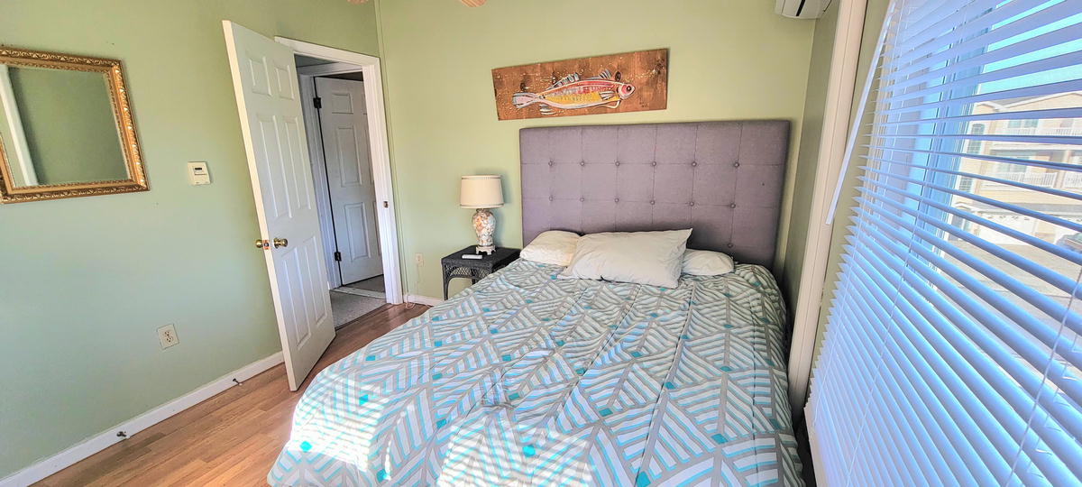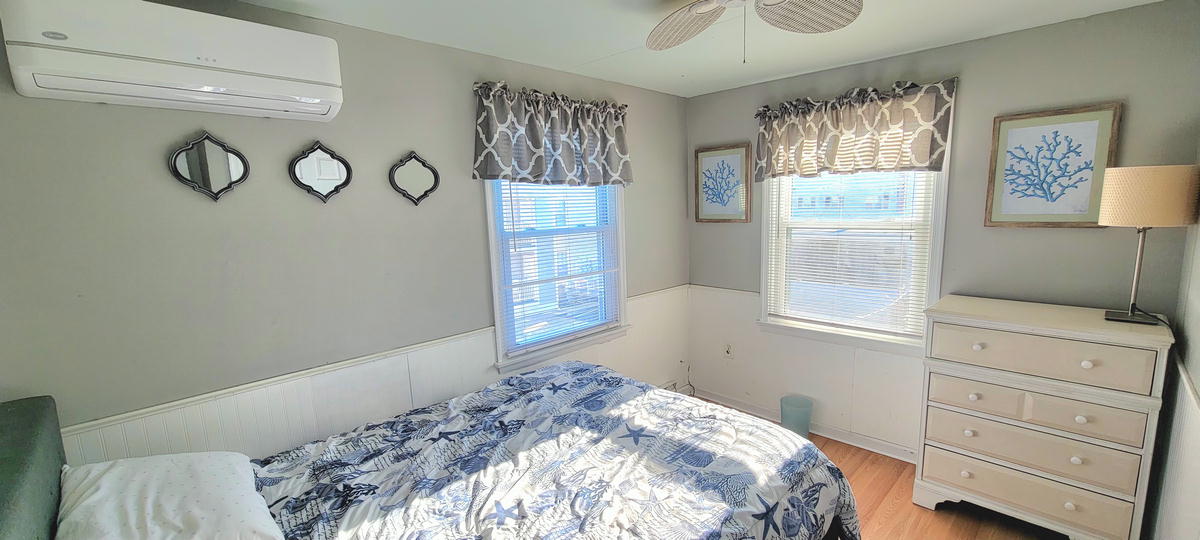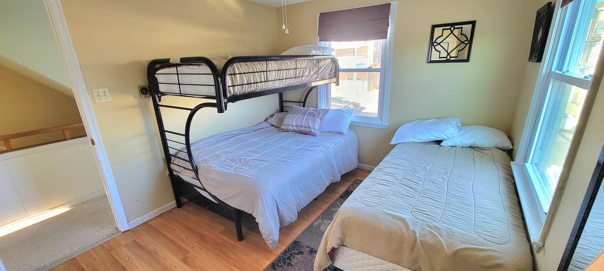 The first floor has hardwood floors throughout.The 2nd floor has 2 bedrooms and a full bathroom. One bedroom with a pyramid bunk (full on bottm and single on top) plus a single bed. Second bedroom with a double bed. The 3rd floor has 2 bedrooms and a full bathroom. Third bedroom with a bunk bed and a single be and fourth bedroom with a queen bed. There are 3 floors to this unit. The air conditoning is mini split units. There is also a queen air mattress.